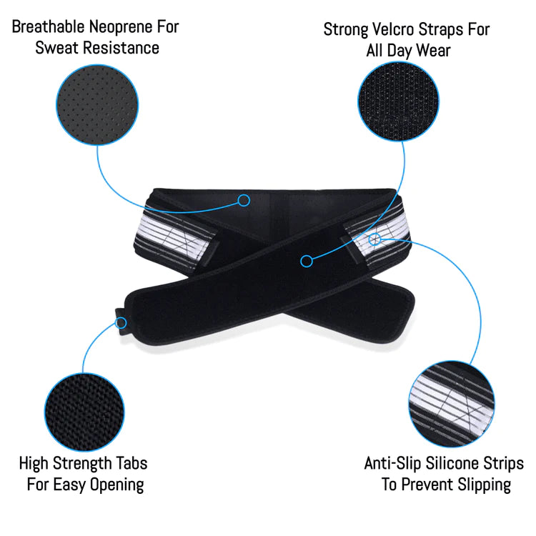 Wear the SI Belt outside your clothing or against your body like a second skin. Inside the belt are several high strength silicon strips that prevent slipping up or down no matter how still or active you are. The SI Belt is made from perforated neoprene and the compressions straps from flexible fishnet ribbon and are both breathable as well as resistant to pilling.